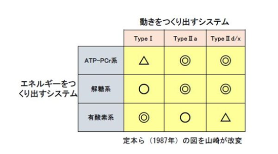 そしてその筋収縮のエネルギーを支えるのが3つのエネルギー供給系です。図のTypeⅠは遅筋系線維、TypeⅡaは速筋系線維、TypeⅡd/x(ヒト:ネズミではTypeⅡb)は超速筋系線維で、ATP-CPr系(ハイパワー系)、解糖系(ミドルパワー系)と有酸素系(ローパワー系)からなる「3×3システム」として協働して機能しています。