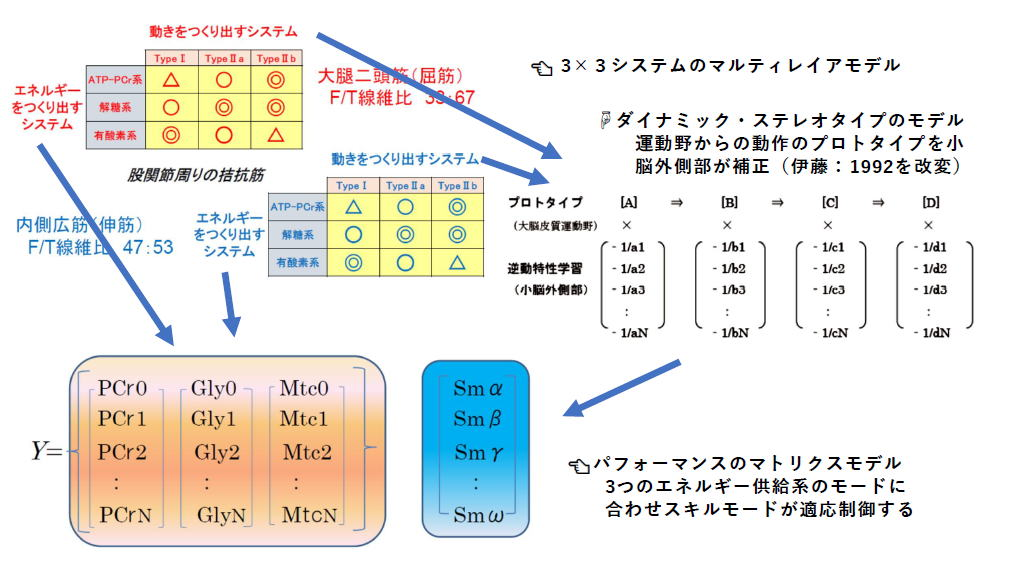 下図は、複数筋の「3✖3システム」の動きを作り出すシステムが運動習熟:ダイナミックステレオタイプとしてスキルを形成し、3つのエネルギーを作りだすシステムがマトリクスとして刻々と「エネルギー供給モード」を変容させ「スキルモード」と適切に連携・調和するというモデルです。