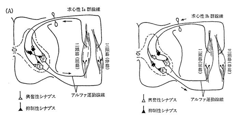 左はいわゆる「伸張反射」で、二頭筋(力こぶの筋)が瞬間的に引っ張られると「筋紡錘」というセンサーからの求心性Ⅰa群線維が脊髄に信号を送り、二頭筋の急速な屈曲と三頭筋の伸展の抑制を引き起こして筋長を維持します。下肢では大腿四頭筋の伸展とハムストリングスの抑制を引き起こして支持脚を支えます。