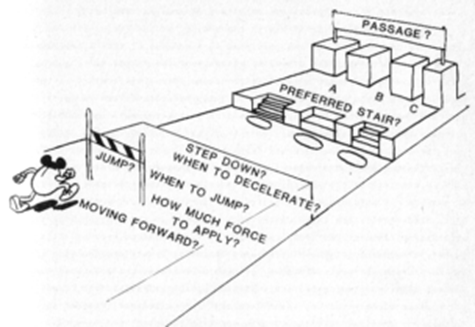 状況に応じて「登れる階段」は「登れない階段」になり、「抜けられる」ゴールは「抜けられない」ゴールとなり、「主体」の状況(移動速度や身体のブレなど)に応じて対応が決定される(TurveyとKugler、1984 )